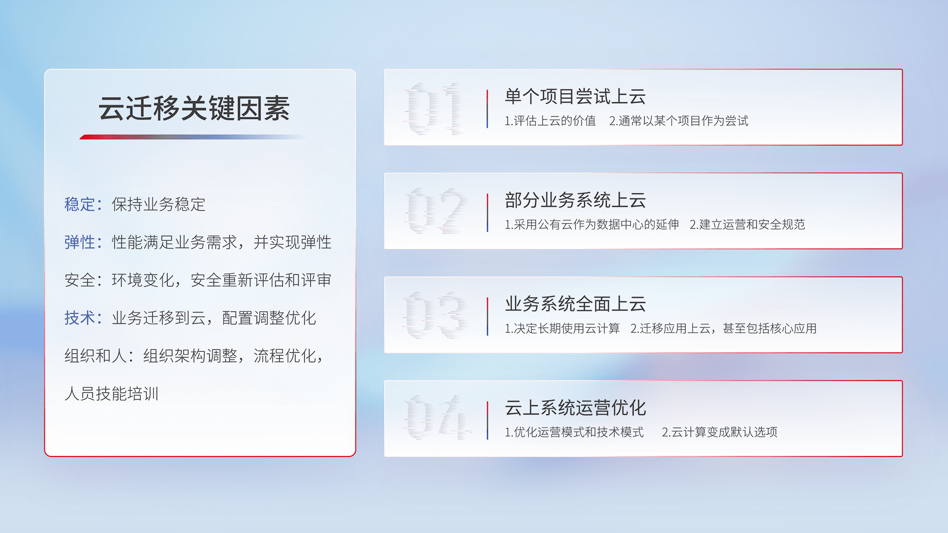 结合实际业务,,从规划设计、、、、云平台选型、、云原生改造、、、、数据迁移、、、集成交付,,迁移全过程为客户识别最佳上云路径,,做好风险识别管理,,设计网络架构、、、身份权限、、安全审计合规、、、、操作审计、、、、日志审计、、监控告警策略、、、、多站点容灾设计等,,对云上基础设施进行整体规划,,,提升IT治理水平,,,以满足弹性、、、、高可用、、、、高性能的需求。。