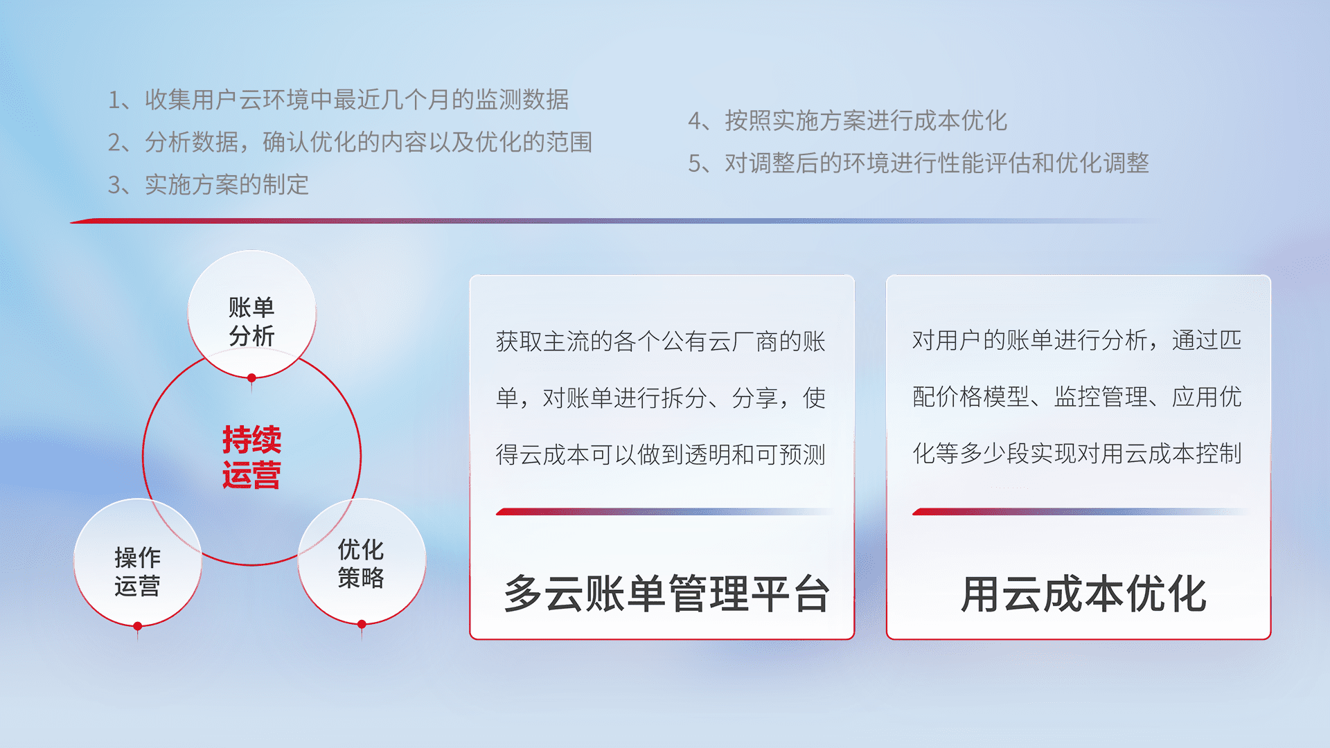 通过多云纳管,,以统一的资源数据模型把客户的云资源进行抽象和封装,,,,进而实现对多云资源的统一操作,,,保障云资源管理的可靠性、、稳定性与可用性。。量身定制化运维内容,,,,配置、、开发运维、、、、补丁管理、、、、备份、、、、监控、、认证和访问管理、、审计和日常巡检等,,,,保障在用云过程中的可靠度,,,稳定度以及高可用率。。。。